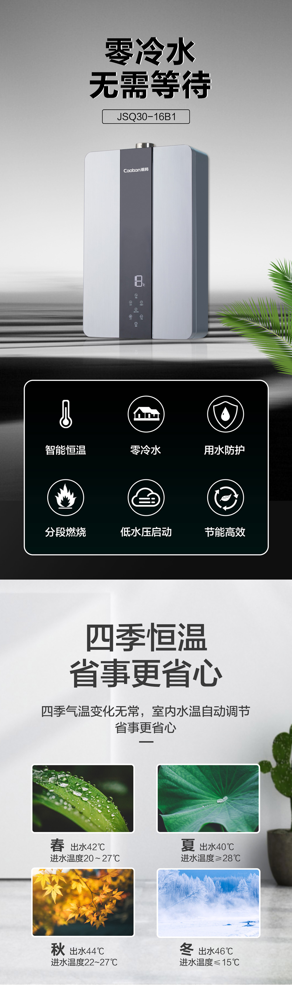 零冷水,智能恒溫,低水壓啟動。