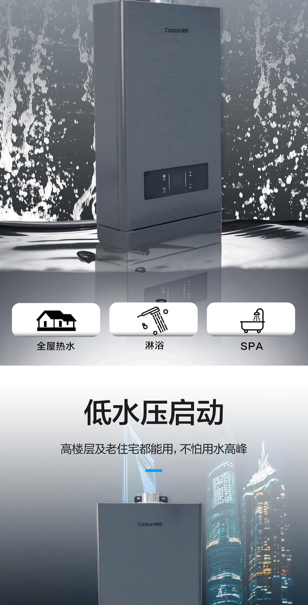 智能恒溫,無氧抑菌水箱,分段燃燒,低氣壓啟動,節能高效。